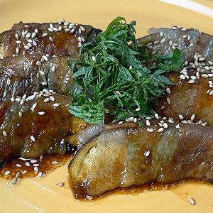 ジューシーな肉で巻いて味噌だれで仕上げた濃厚な味わい。